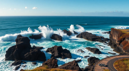 A powerful ocean with waves crashing against rocky cliffs and a coastal road.