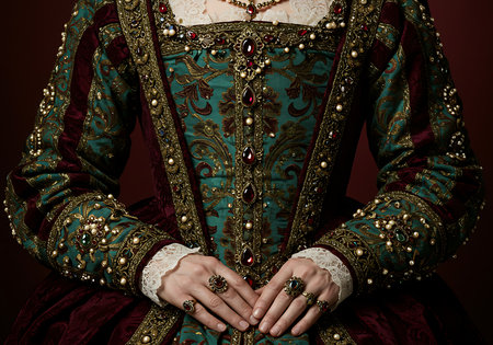 Close-up of a richly detailed Renaissance-era gown, showcasing elaborate embroidery, jewels, and pearls. Generative Ai