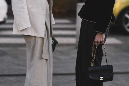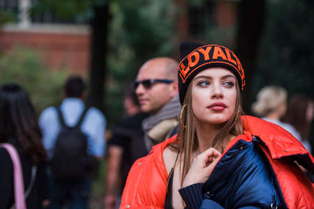 Milan, Italy - February 20, 2019: Street style outfits - models, bloggers and influencers before a fashion show during Milan Fashion Week - MFWFW19