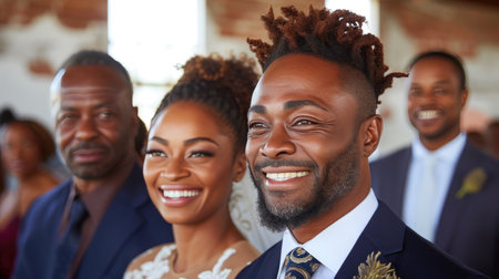 A beautiful African couple dressed in traditional clothing sharing a moment of joy at their village wedding. Both are smiling, surrounded by cultural attire and decorations.