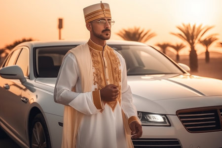 Handsome Arabian man in traditional clothing standing near luxury car at sunset