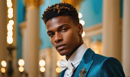 A young man in a teal suit and bow tie poses for a portrait in an indoor setting