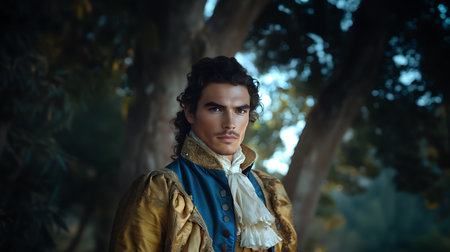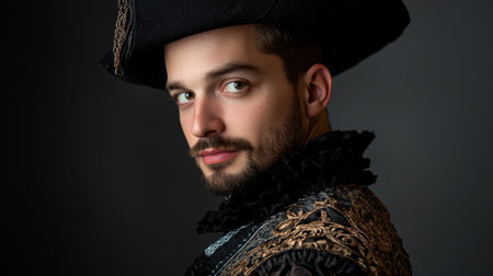 A graceful musketeer dressed in period garb, displaying courage and gallantry in a captivating Renaissance environment