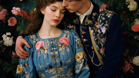 Capturing passion in the renaissance, victorian, and baroque era: a timeless love story portrayed by a couple in vintage attire, embracing the elegance, romance, and nostalgia of historical periods