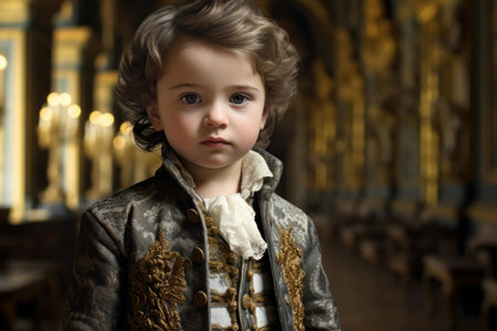 Young child dressed in elaborate historical clothing poses in a grand, ornate hall