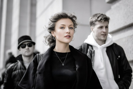 Multiethnic group of young hipsters stands together on street against gray brick wall. Diverse Stylish people in outerwear outdoor, youth culture