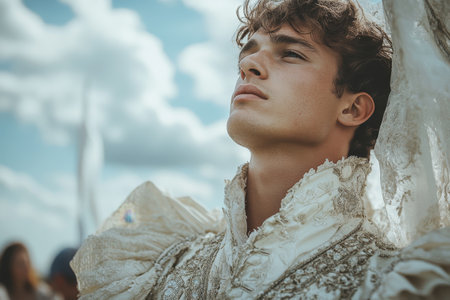 A young man dressed in a beautifully detailed, ornate costume stands outdoors, gazing upward. The sky is partly cloudy, and he seems to be enjoying the atmosphere of a vibrant festival celebration that surrounds him.