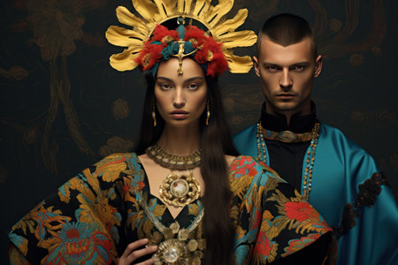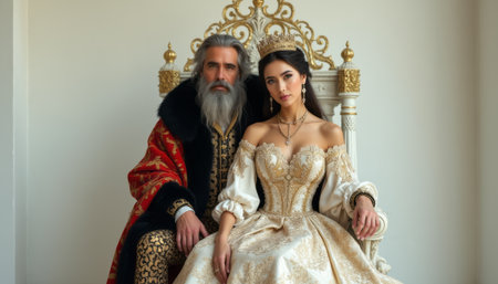 A striking couple stands together, exuding elegance and authority, dressed in luxurious historical costumes. The woman, adorned with a delicate crown and intricate jewelry, complements the man’s majestic fur-lined coat and elaborate hat, creating a captivating scene of royal grandeur.