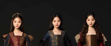 Group of people in medieval historic clothes posing on dark background. Aristocratic portrait