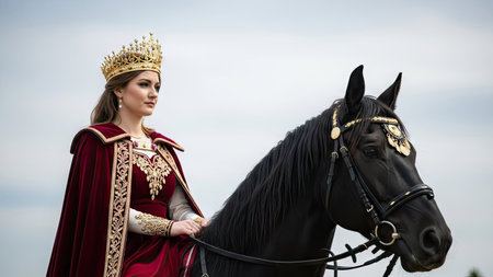 A woman wearing a crown and cape rides a black horse. The image showcases elegant clothing details with gold accents. Natural light illuminates the subjects against a soft, blurred background. Suitable for royalty, historical, or fantasy concepts in design projects, advertising campaigns, or editorial publications.