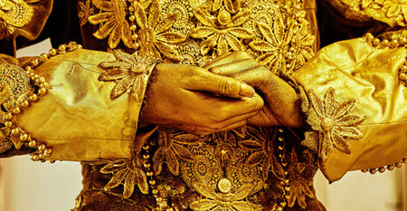 Intricate golden attire highlights skilled craftsmanship during a vibrant cultural festival celebration in a lively city setting at dusk