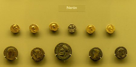 Display of ancient Roman gold and silver coins featuring Emperor Nero at the Merida Museum, Spain, showcasing numismatic history and imperial portraits.