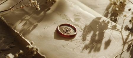 An elegant wax seal sticker mockup placed on a wedding invitation, with soft natural light enhancing the romantic atmosphere, ideal for wedding-related products, --ar 16:7 --v 6 Job ID: 15ea5b6b-f16f-410b-8212-ccb86e4faf7f