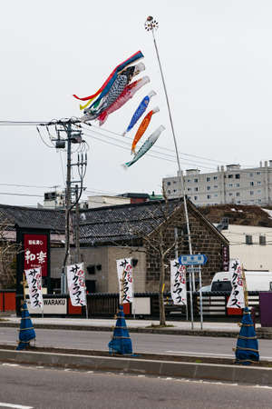 Koinobori (Koi Kite) flow with the wind over the house on the main road in winter in Hokkaido, Japan.
