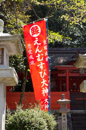MAY 2019 - WAKAYAMA, JAPAN: Dedication flags along the stone staircase leading to the Kumano Hongu Taisha at the Kumano Kodo pilgrimage trail
