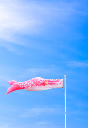 Pink and white Koi fish flag against cloud on blue sky background in minimal style and vertical frame