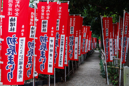 Colorful red banners with Japanese script decorate a tranquil shrine path, creating a vivid cultural scene perfect for themes of tradition, travel, heritage, and outdoor ceremony at a temple setting.
