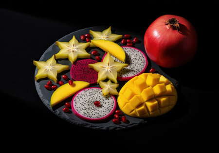 A high-contrast studio presentation of striking abstract composition of exotic fruits, including slices of star fruit, dragon fruit, vibrant mango, and whole pomegranate on a dark platter