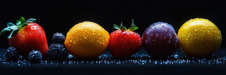 Assorted fruits including strawberries, blueberries, and citrus with water droplets are placed on a dark surface for emphasis.