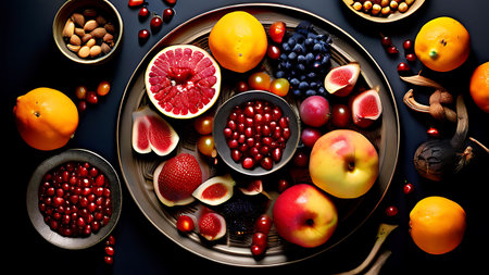 A colorful assortment of fresh fruits including apples, pomegranates, figs, and berries arranged on a dark background, highlighting their natural beauty and variety.