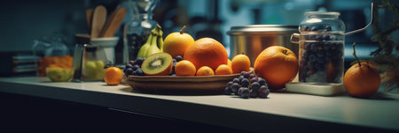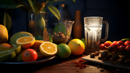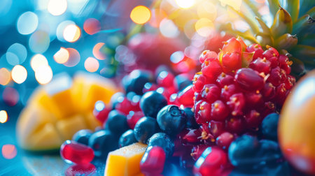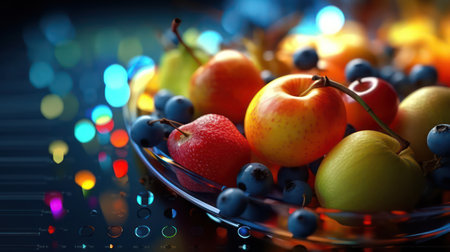 Mix-Fruits in a glass plate with bokeh lights on background. 3D AI generated image