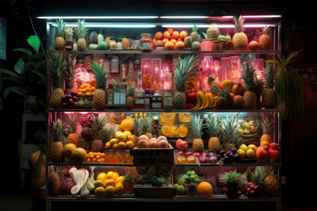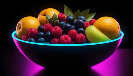 A colorful and abundant display of assorted fresh fruits, artfully arranged and bathed in gentle neon glow.