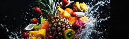 Fruit splashes on a black background, with a pineapple and a coconut at the center. A tropical fruit explosion of water droplets flying through space, with banana leaves and coconuts. Fruits including pineapples, dragon fruits, strawberries, kiwi fruits, oranges, mangoes, and bananas are floating in mid-air. The splash is dynamic and vibrant against a dark backdrop. High-resolution, professional photograph, amazing quality, realistic photo, hyper-realistic, cinematic lighting. --ar 33:10 --v 6.1 Job ID: 7ebf8651-9d2f-4fee-b716-6e50d599efee