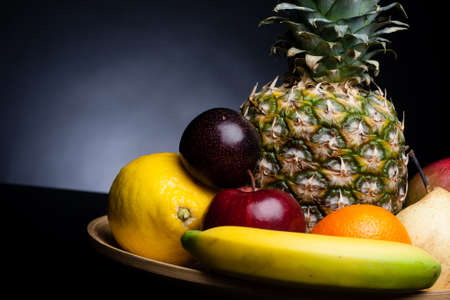 Various colorful fruit on dark background. Selective focus.
