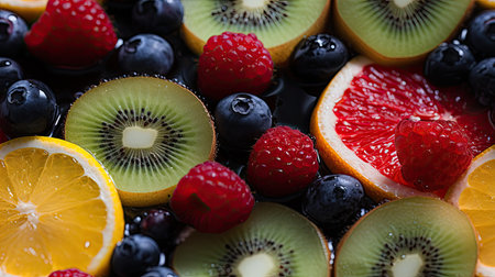 A close-up of an assortment of fresh fruits, including sliced oranges, kiwis, raspberries, and blueberries, showcasing vibrant colors and healthy natural produce.