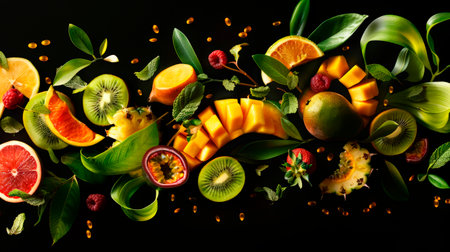 A captivating arrangement showcases an array of tropical fruits including mangoes, kiwis, and passion fruits, intertwined with lush green leaves, creating a lively and colorful wave.
