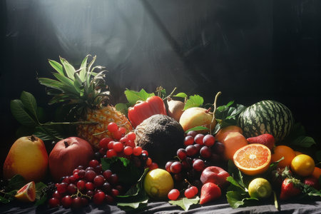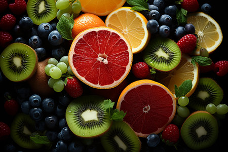 Vibrant assortment of fresh fruits on dark background.
