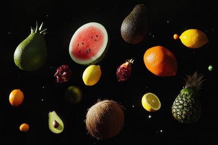 An array of colorful fruits levitates in a star-studded space, creating a captivating and imaginative representation of nature's delights.