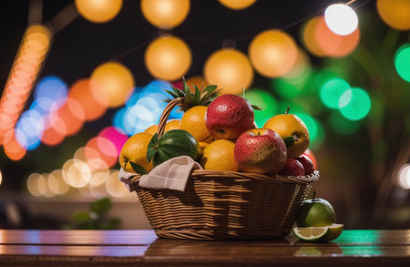 Fruits in a basket on a wooden table with bokeh lights background