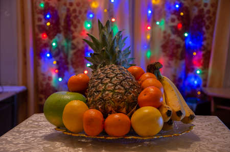 Fruit tray with pineapple, tangerines, bananas and bokeh effect, christmas