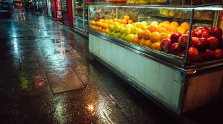 A lively scene capturing a fruit stall on a rainy night, showcasing fresh oranges and apples. The colorful display reflects the vibrant life of city streets.