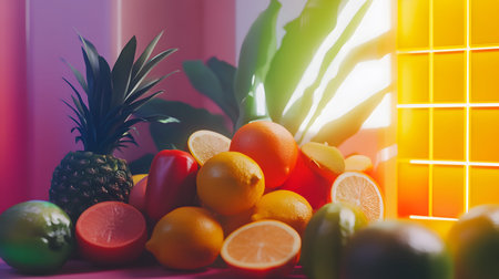 A vibrant arrangement of various fruits including pineapple, oranges, and lemons against a colorful background.