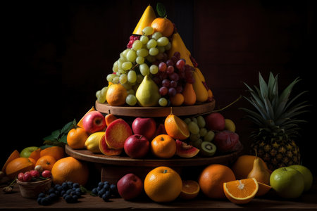 Big pyramid of different fresh juicy tasty fruits, AI Generated illustration