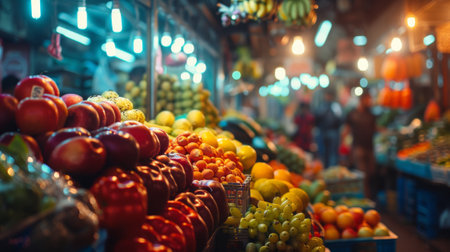 Variety of fresh, colorful fruits on display at the local market for sale - healthy lifestyle