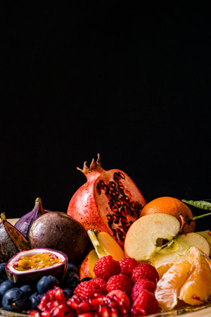 Variety of fresh fruits on black background. Healthy food concept.