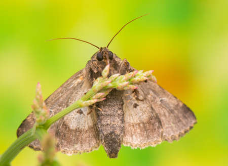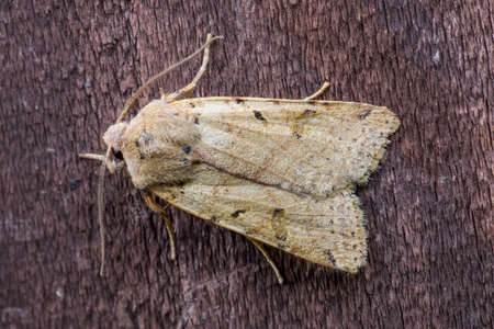 Closeup on the lightbrown obscure wainscot owlet moth, Leucania obsoleta , sitting on a piece of wood in the garden