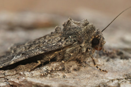 Detailed closeup on a True Lover's Knot moth, Lycophotia porphyrea, sitting on lichen covered wood in the field