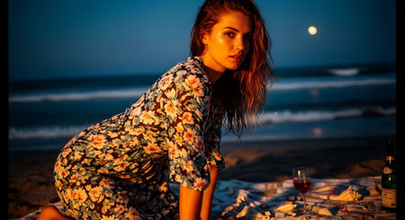 A woman in a floral dress sits on a beach blanket by the ocean at sunset, with wine glasses and a bottle on the sand.