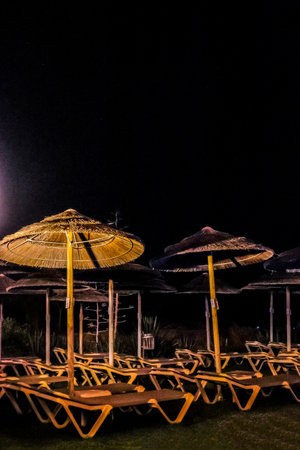 Chairs and umbrella on the beach at night. Shallow depth of field