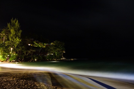 A nighttime scene showcases a tranquil beach with the ocean meeting the sandy shore. Palm trees line the edge, illuminated by streetlights. Reflections from the lights glimmer on the wet sand. The dark sky hints at a peaceful evening, suitable for various editorial and commercial applications.