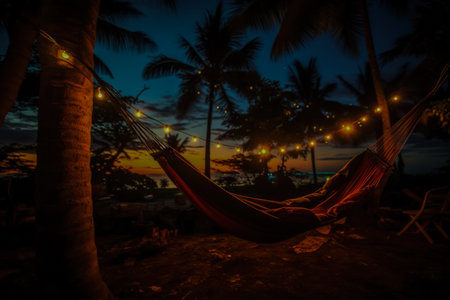 A tranquil beach scene at dusk displays a calm ocean under a moonlit sky. Lanterns illuminate seating areas and a thatched-roof structure. Palm trees frame the composition, with warm tones and soft lighting creating a peaceful environment, suitable for various editorial and commercial applications.