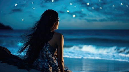 A serene woman sitting on a beach at night, enjoying the moonlight and ocean view