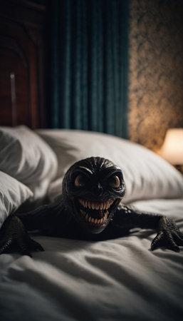 Terrifying nightmare creature lurking beneath bed in dimly lit bedroom capturing essence of fear and unknown at night. Grotesque creature with haunting features emerges quietly from under the bed. AI