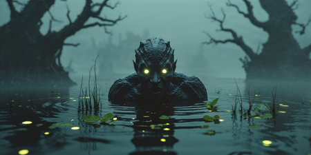 AI Generated. Dark Supernatural Creature Emerging From Shadowy Water