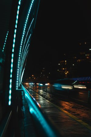 Lights of cars at night. Street lights. Night city. Long-exposure photograph night road. Colored bands of light on the road. Wet road after rain.