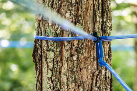 A detailed view of the modern maple sap collection system in Quebec, Canada, showing blue plastic tubing attached to maple trees in the forest for extracting sap used in maple syrup production
